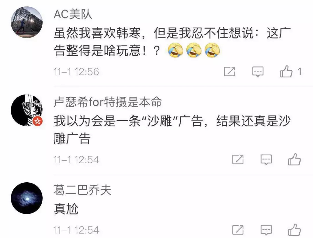 短片中,一個人在鋼筆商店里一本正經(jīng)的挑選“腔調(diào)筆”,結(jié)尾畫面一轉(zhuǎn),韓寒穿著賽車服說:“腔調(diào),是買不到的”,說完用鋼筆畫出耐克的logo。帶著滿頭的問號看完之后,發(fā)現(xiàn)網(wǎng)友們都有共同的疑問,這支廣告究竟在說啥?沒看懂......
