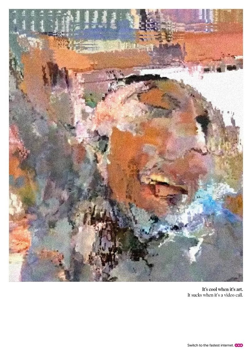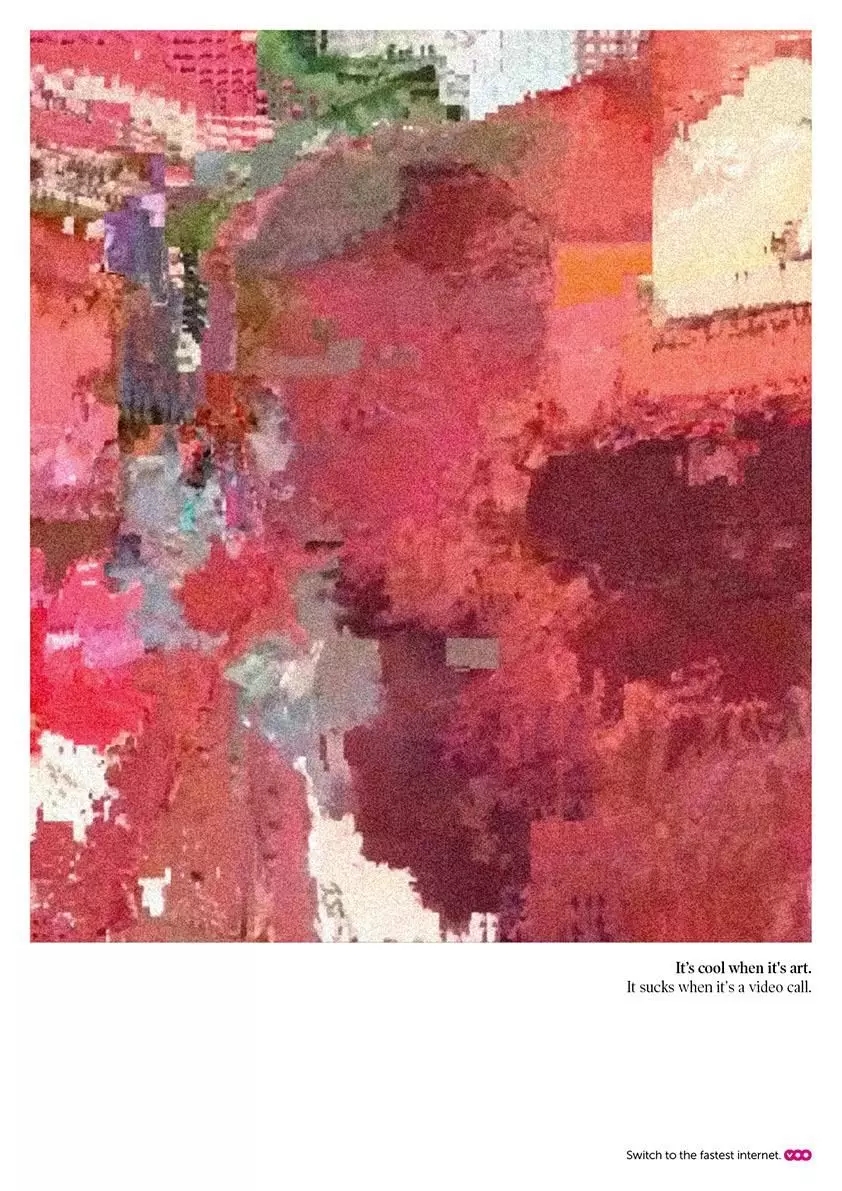 比利時(shí)的VOO電信公司把一些信號(hào)不好的視頻通話截圖做成了平面廣告,抽象的畫面看起來像是藝術(shù)畫作,用簡潔的 文案意在宣傳自家公司高速的寬帶網(wǎng)絡(luò)服務(wù),如果不想讓糟糕的視頻通話把生活變成抽象的藝術(shù)品,那就選擇VOO的寬帶服務(wù)吧。