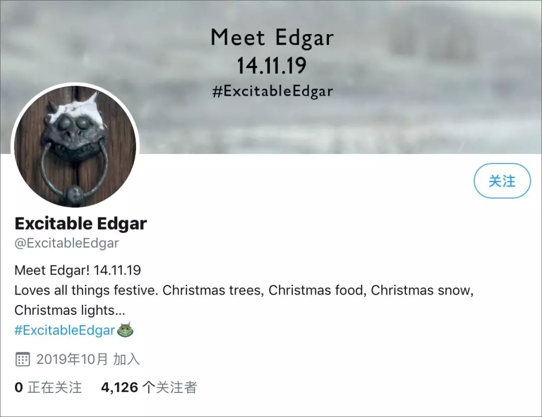 如此撩動(dòng)人心的小火龍形象顯然不能只在廣告時(shí)間短暫地出現(xiàn)在人們的視線中,John Lewis在推特上為小火龍注冊(cè)了名為Meet Edgar的專屬頁面,目前已經(jīng)圈粉4000多人。