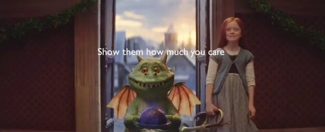 小女孩成功地幫助蠢萌的小火龍融入人群,給故事拿出個(gè)“完美又溫暖的結(jié)局”,這是她送給好朋友最好的圣誕禮物。禮物的意義在于:告訴自己關(guān)心的人你在乎他們。這是第一條紀(jì)念John Lewis和連鎖超市Waitrose聯(lián)合圣誕節(jié)活動(dòng)的廣告。